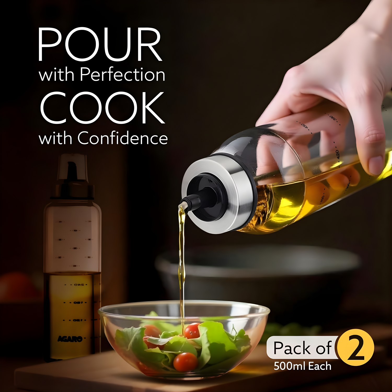 AGARO Elite Borosilicate Glass Oil Dispenser With Capacity Markings, Pack of 2, 500 ML each, Metallic Lid, Oil Bottle Jar, Transparent