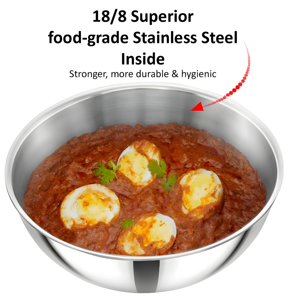 - Advanced 3 mm Extra-thick Tri-Ply Stainless Steel - Spreads heat up the walls, food does not burn and stick.