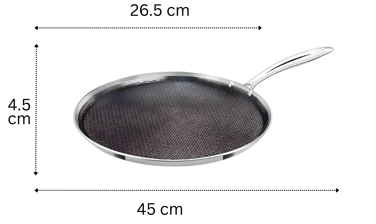 - COLOR: Silver; Material: Stainless Steel; Package Contents: 1 - Piece Triply Hexa Tech Induction Stainless Steel Tawa .