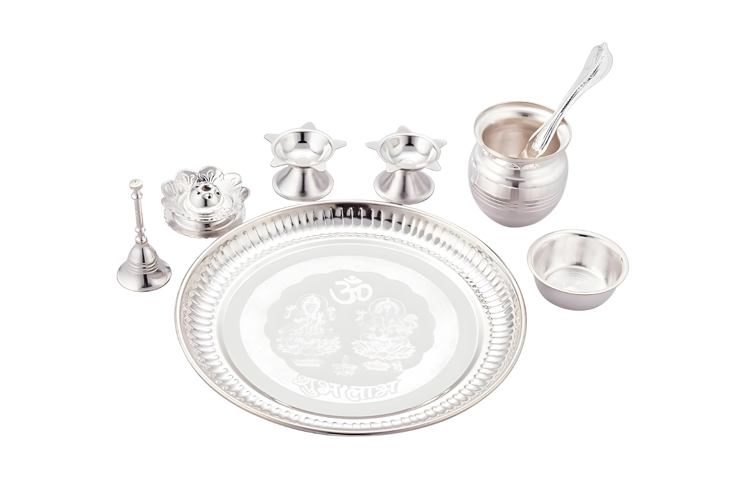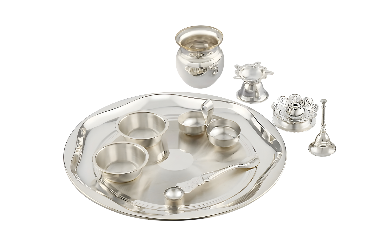 Material used Pure Silver plated pooja set with premium quality stainless steel as the base metal. |